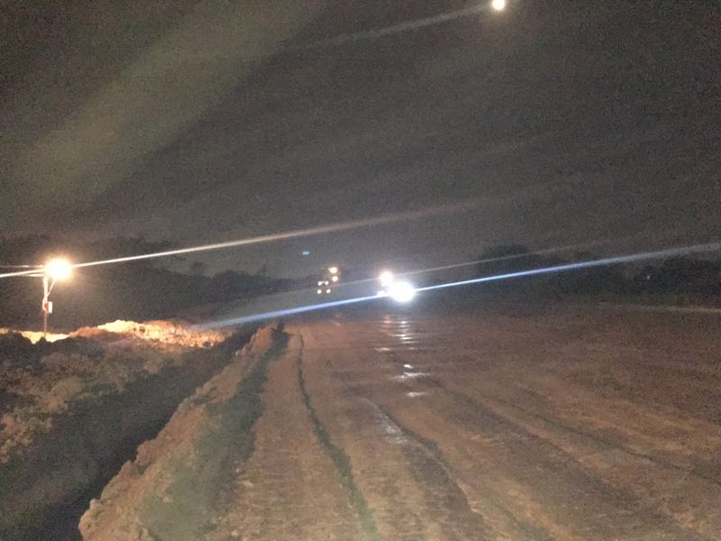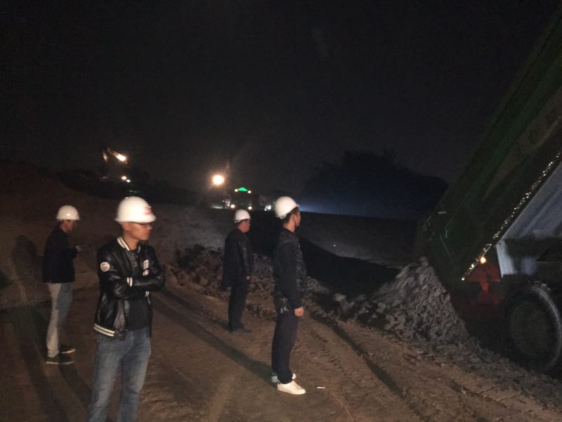 明亮的探照燈刺破黑暗的夜瓊,開辟出一片亮色。亮光里,絡(luò)繹不絕的車輛安靜行進(jìn),相隔不遠(yuǎn)的施工人員有序指揮,裝載,回填,推土、碾壓,所有的工序有條不紊,一條寬闊的路基漸漸成型!
