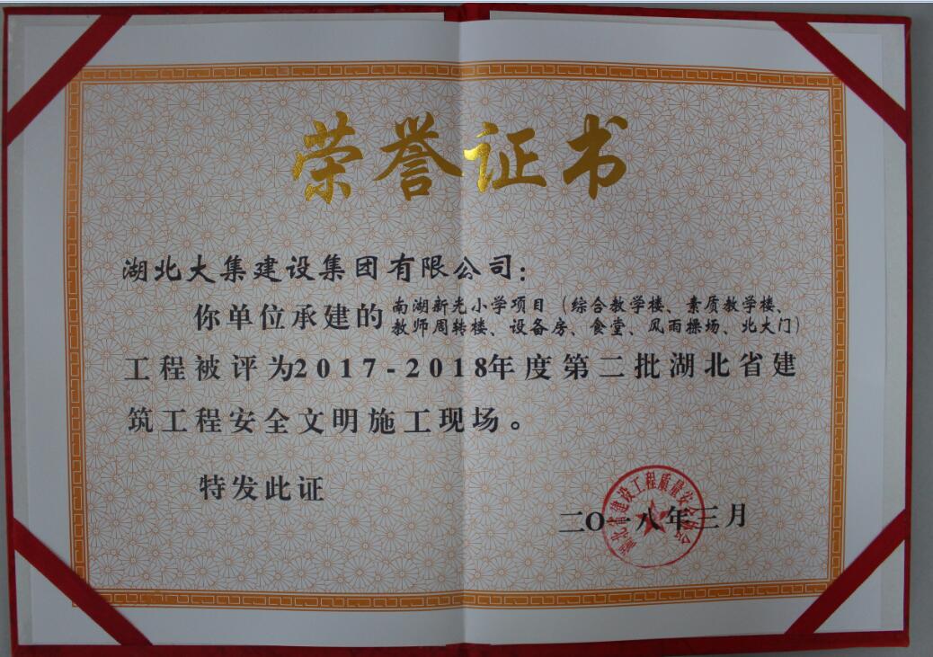 南湖新光小學(xué)項(xiàng)目(綜合教學(xué)樓、素質(zhì)教學(xué)樓、教師周轉(zhuǎn)樓、設(shè)備房、食堂、風(fēng)雨操場(chǎng)、北大門(mén))工程被評(píng)為2017-2018年度第二批湖北省建筑安全文明施工現(xiàn)場(chǎng)(楚天杯);綜合教學(xué)樓工程被評(píng)為2016-2017年度第四批湖北省建筑結(jié)構(gòu)優(yōu)質(zhì)工程!