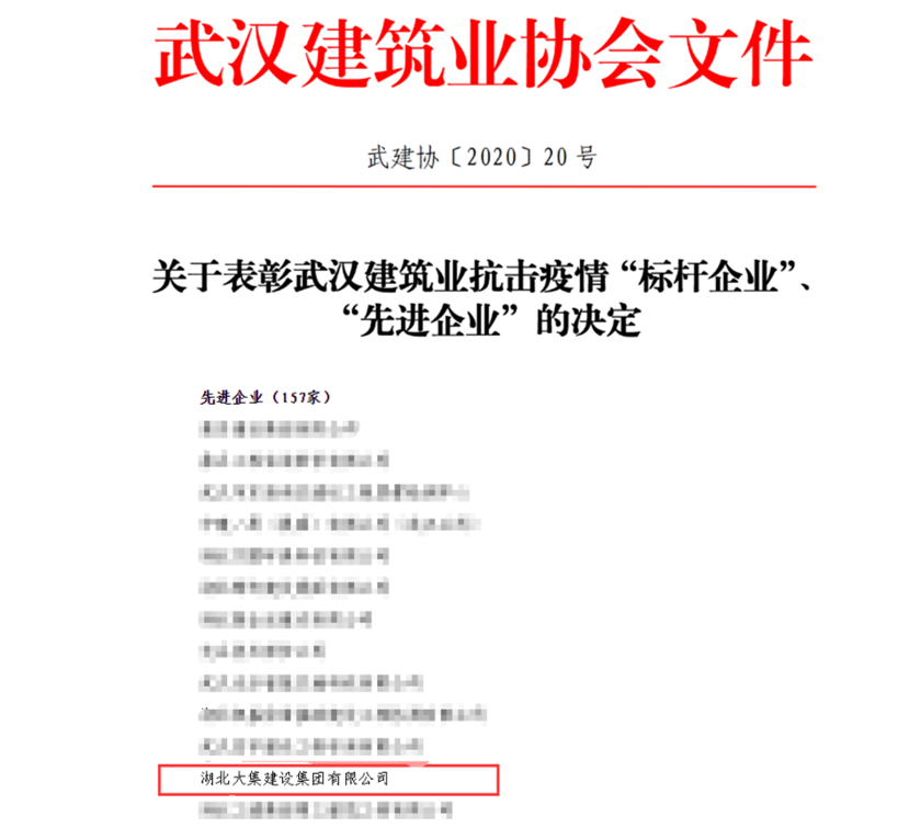 4月14日,武漢建筑業(yè)協(xié)會(huì)發(fā)布《武建協(xié)〔2020〕20 號(hào)——關(guān)于表彰武漢建筑業(yè)抗擊疫情“標(biāo)桿企業(yè)”、“先進(jìn)企業(yè)”的決定》,對(duì)在抗疫“主戰(zhàn)場(chǎng)”積極擔(dān)責(zé),奮不顧身、盡銳出戰(zhàn),與死神賽跑、與疫魔競(jìng)速的27家武漢建筑業(yè)“標(biāo)桿企業(yè)”、157家“先進(jìn)企業(yè)”進(jìn)行表彰。湖北大集建設(shè)集團(tuán)因在抗疫過(guò)程中主動(dòng)作為、勇于擔(dān)當(dāng),獲評(píng)“先進(jìn)企業(yè)”榮譽(yù)稱號(hào)。
