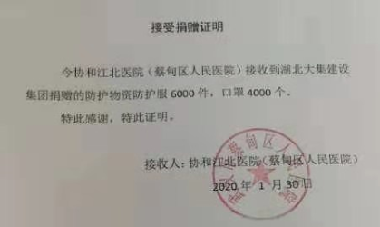 集團(tuán)公司向蔡甸區(qū)人民醫(yī)院捐贈(zèng)防護(hù)物資