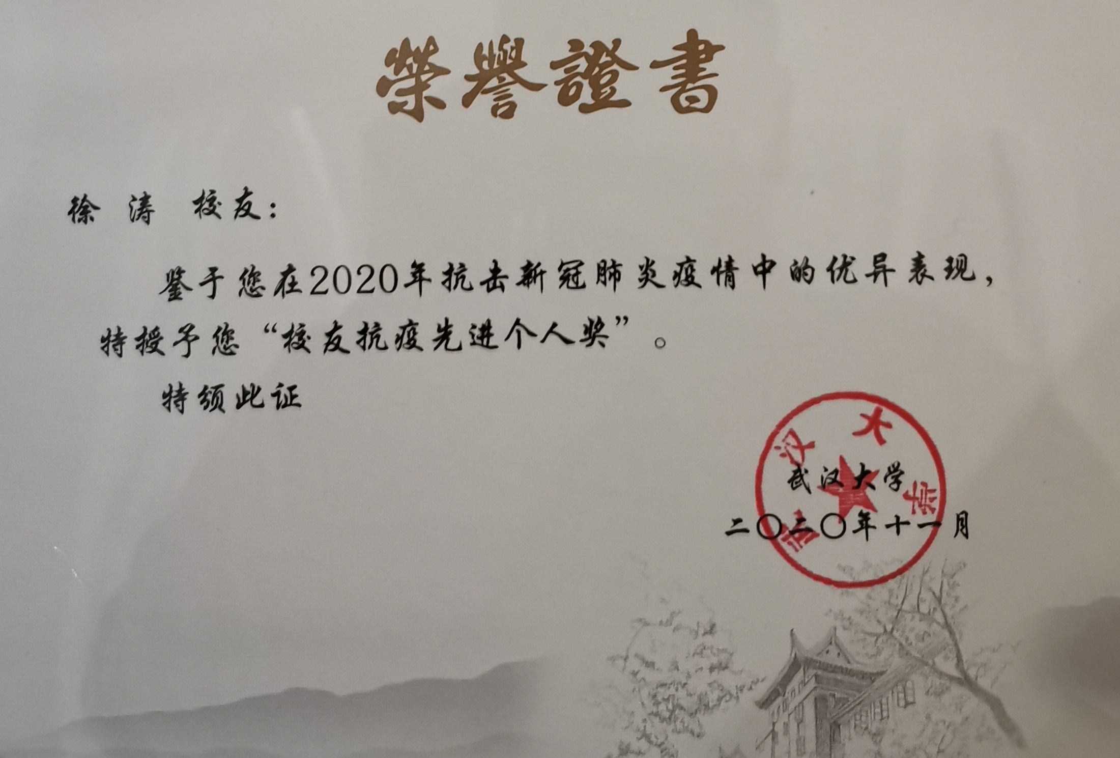 集團(tuán)董事長徐濤獲武漢大學(xué)“校友抗疫先進(jìn)個人”表彰