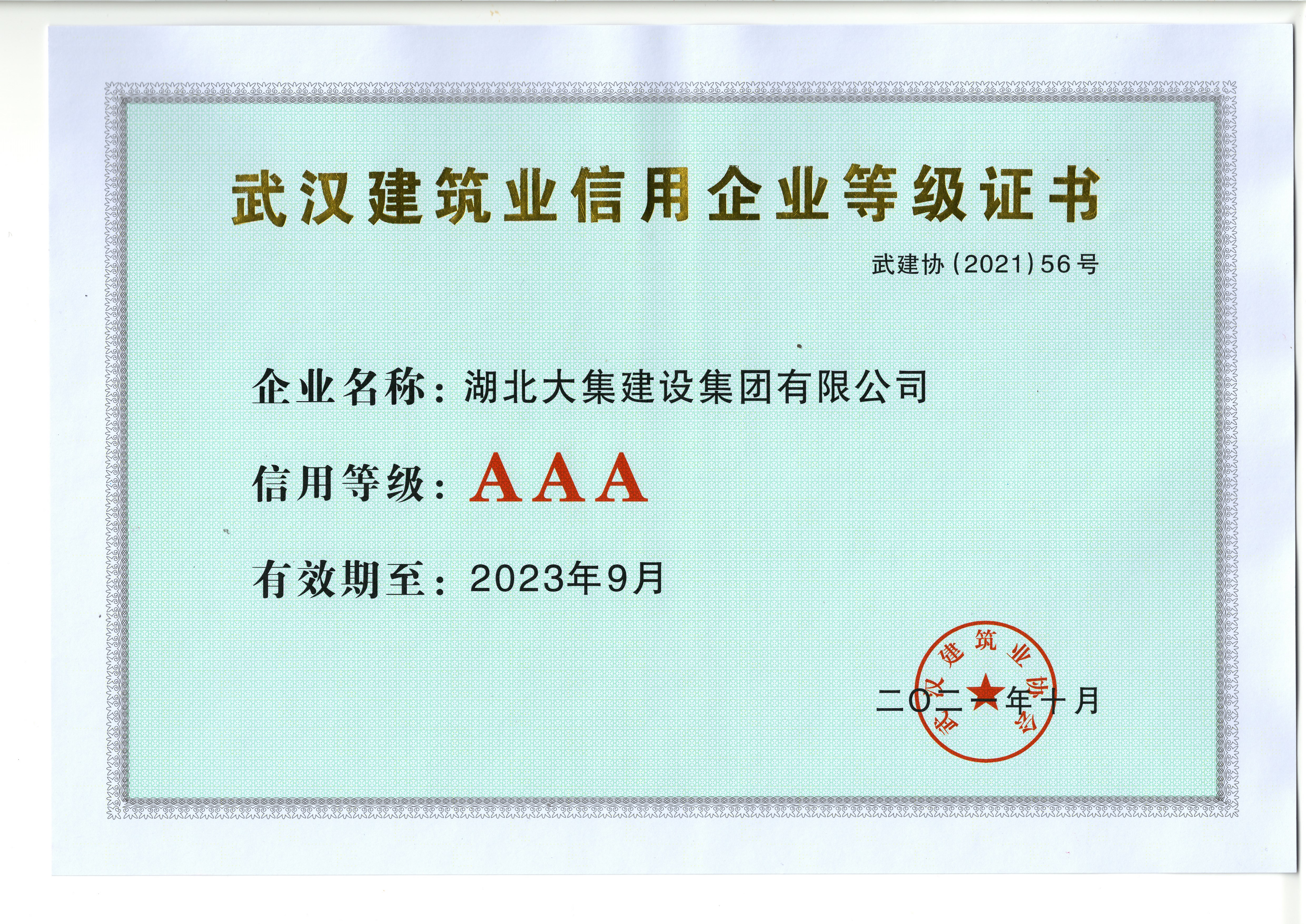 喜訊!湖北大集建設集團再次獲評“武漢建筑業(yè)AAA信用企業(yè)”