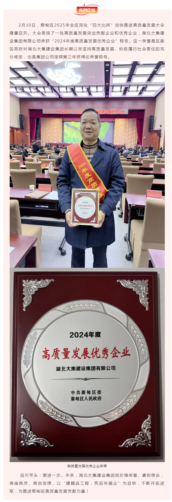 喜訊!湖北大集建設(shè)集團(tuán)榮獲蔡甸區(qū)“2024年度高質(zhì)量發(fā)展優(yōu)秀企業(yè)”榮譽(yù)