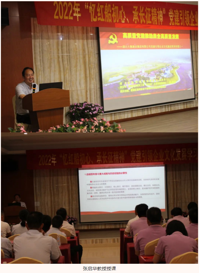 接著,湖北省委講師團(tuán)基層理論宣講員張啟華教授以“高質(zhì)量黨建推動(dòng)企業(yè)高質(zhì)量發(fā)展”為主題進(jìn)行授課。張教授從“苦難與輝煌”、“消失與崛起”、“巨變與挑戰(zhàn)”、“經(jīng)驗(yàn)與啟示”、“輝煌與蝶變”五個(gè)方面分別講述了中國共產(chǎn)黨的百年奮斗史、跌宕起伏中國房企十年之變、房企掌舵者眼中的2022年、紐約灣區(qū)發(fā)展成為世界級灣區(qū)的原因以及高科技贏在新時(shí)代的內(nèi)容,并在講解中融入了湖北大集建設(shè)集團(tuán)和武漢閱景匯兩家公司的發(fā)展歷程,讓大家對中國共產(chǎn)黨的發(fā)展、公司的發(fā)展以及個(gè)人的發(fā)展有了更加清晰的認(rèn)識(shí)以及深刻的反思。