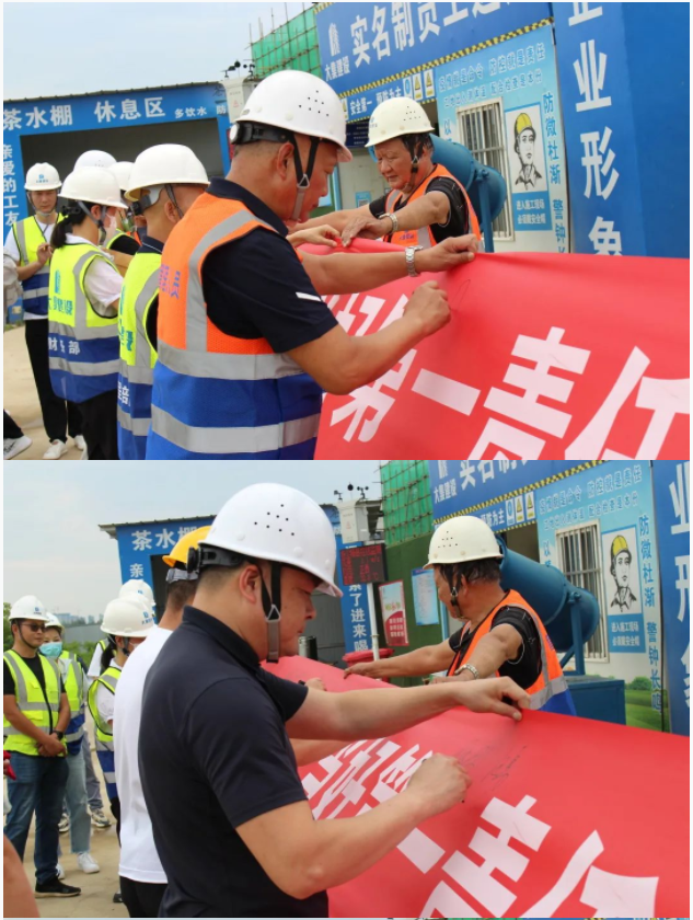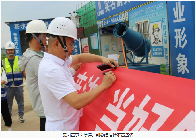 活動開始,集團董事長徐濤、副總經(jīng)理徐家富及各部門負(fù)責(zé)人、各項目經(jīng)理率先在“遵守安全生產(chǎn)法,當(dāng)好第一責(zé)任人”條幅上鄭重簽名,寫下對肩負(fù)安全生產(chǎn)責(zé)任的承諾,隨后各項目施工員、安全員紛紛在條幅上寫下自己的名字,表達(dá)對做好安全生產(chǎn)相關(guān)工作的信心和決心。